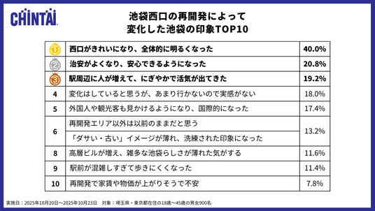 お部屋探しのリーディングカンパニー株式会社CHINTAI(本社:東京都港区 代表取締役社長 奥田倫也)は、東京都と埼玉県に在住の男女900名を対象に、「池袋の治安イメージと再開発による意識変化」に関する調査を実施しました。