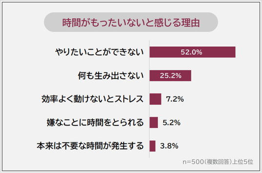 「時間がもったいないと感じる理由」の圧倒的1位は「やりたいことができない(52.0%)」で、半数以上の人から票を集めました。2位「何も生み出さない(25.2%)」と答えた人も多くなっています。