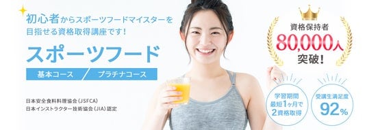 この講座では、スポーツフードマイスターとアスリート栄養食インストラクターの2つの資格を同時に取得できます。栄養素の働きや、筋肉や脳を動かすエネルギー源、体の機能を正常に保つビタミン、高校生・大学生・スポーツ選手のための栄養と食事など、スポーツ栄養学や食事管理に関する専門知識を証明する資格です。