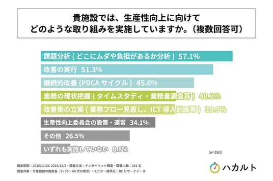 慢性的な人手不足が深刻化する介護業界において、業務効率化や「生産性向上」への取り組みは急務となっています。しかし、現場では改善の第一歩となる業務の現状把握において、リソースやノウハウ不足が大きな障壁となっており、客観的なデータに基づいた改善活動が十分に進んでいない現状があると考えられます。実際には、現場で労働環境の改善などの取り組みがどの程度行われているか、その実態はあまり明らかになっていません。そこで「ハカルト」は、介護施設における生産性向上の取り組み状況や、業務量調査の実態と課題を明らかにするため、調査を実施しました。