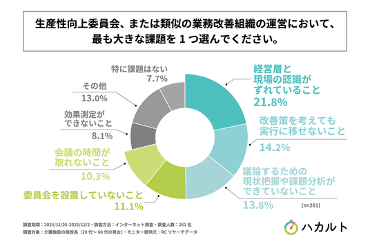 次に、「生産性向上委員会、または類似の業務改善組織の運営における、最も大きな課題は何か」を尋ねる設問への回答では、1位が「経営層と現場の認識がずれていること」で21.8%、2位が「改善策を考えても実行に移せないこと」で14.2%、3位が「議論するための現状把握や課題分析ができていないこと」で13.8%という結果になりました。また、4位以降も回答率10%を超える回答が複数並ぶ形となり、この結果から、介護施設の施設長が考える生産性向上委員会(または類似組織)の運営における課題は、多岐にわたることが明らかになりました。