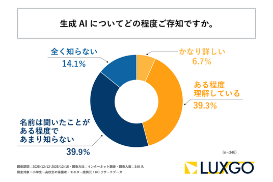 LUXGO株式会社(ルクスゴー株式会社、本社:東京都台東区、代表取締役:中川 慶悟)が運営する「Kidsプログラミングラボ 秋葉原教室」は、小学生~高校生の保護者を対象に「生成AI時代における子どもの教育に関する保護者の価値観調査」を実施しました。この調査から、小学生~高校生の保護者の生成AIに対する認知度や、子どもの学習における利用実態、将来への影響に関する期待と懸念などが明らかになりました。