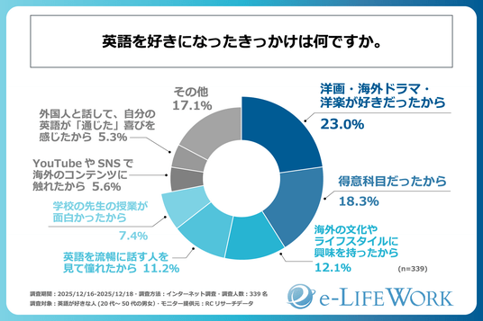 世界的に英語学習の需要が急速に増加しており、子どもに英語を学習させたいと思う親や、自己成長やスキル向上を目指す学習者が世界中で増加していることに注目が集まっています。このような状況下ですが、実際に「英語が好き」と感じ、積極的に学習に取り組む人々がどのようなきっかけで英語を好きになり、現在英語を活用しているのか、また英語を教える仕事に対してどのような意識を持っているのかについての詳細なデータはありません。そこで、株式会社e-LIFEWORKは、英語が好きな人を対象に、「英語が好きになるきっかけと英語力の活用に関する調査」を実施しました。