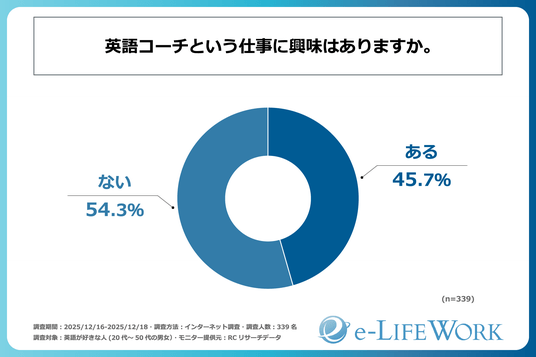 調査の最後、「英語コーチという仕事に興味はあるか」を尋ねる設問への回答では、「ない」が54.3%、「ある」が45.7%という結果になりました。この結果から、「興味がない」という人の割合の方が多かったものの、英語を好きな人のうち、4割以上の人が「英語コーチ」という仕事に興味があることが判明しました。