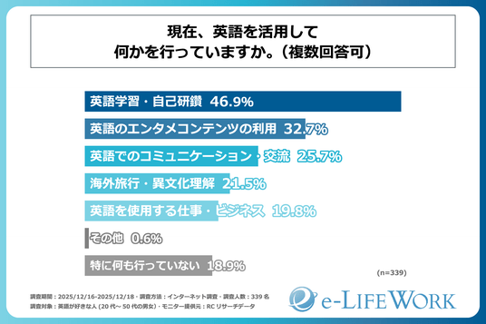 また、「現在、英語を活用して何かを行っているか」を尋ねる設問の回答では、1位が「英語学習」で46.9%、2位が「英語のエンタメコンテンツの利用」で32.7%、3位が「英語でのコミュニケーション・交流」で25.7%という結果になりました。この結果から、英語を好きな人が現在、英語を活用して行っていることは主に「英語学習・自己研鑽」や「英語のエンタメコンテンツの利用」であることが明らかになりました。