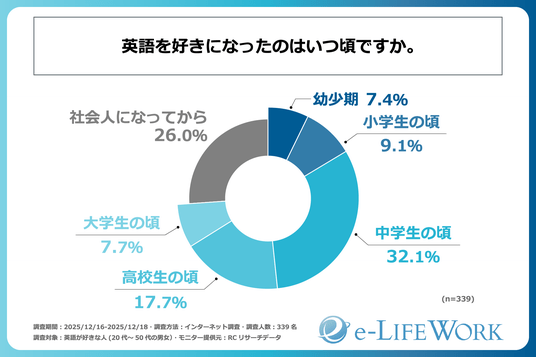 英語好きな人が英語を好きになった時期は中学生の頃が最も多いものの、4人に1人は社会に出た後、英語を好きになっている! e-LIFEWORKが「英語が好きになるきっかけと英語力の活用に関する調査」を実施