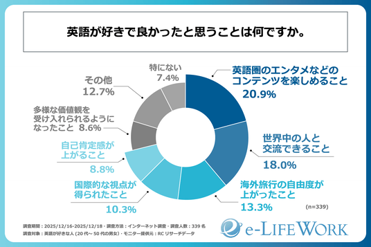 株式会社 e-LIFEWORK(本社:東京都渋谷区、代表者:川崎 真希)は、英語が好きな方(20代~50代の男女)を対象に「英語が好きになるきっかけと英語力の活用に関する調査」を実施しました。この調査結果から、英語が好きな方が英語を好きになったきっかけや、英語力をどのように活用しているか等が明らかになりました。