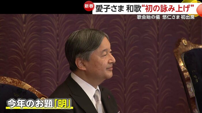 陛下が選ばれた2026年のお題は「明」で、1万4000首を超える応募から選ばれた10人の歌が古式ゆかしい節回しで詠みあげられた。