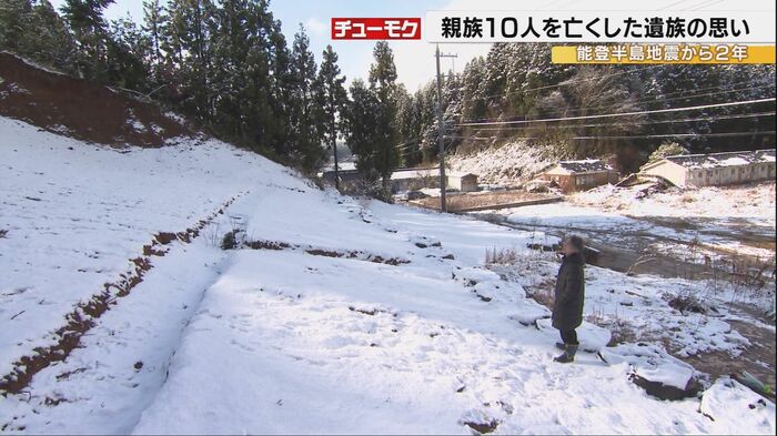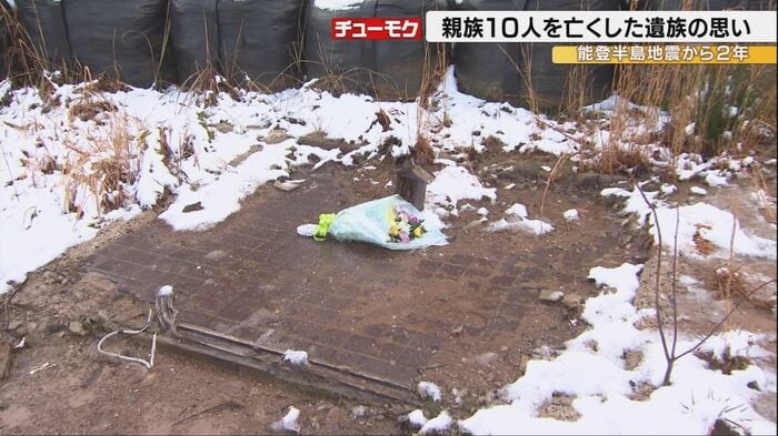 能登半島地震による土砂崩れで家族と親戚あわせて10人を亡くした寺本直之さん。地震から2年の節目を迎えた元日、寺本さんは穴水町の現場を訪れ花を手向けた。