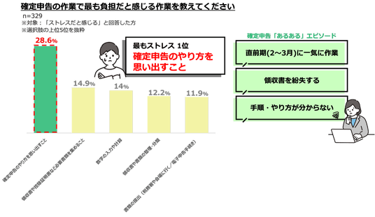 2.負担を感じる作業1位は「やり方を思い出すこと」 確定申告に関する“あるある”上位に「2~3月の直前期にまとめて作業してしまう」「領収書を紛失する」 ⇒準備や記憶の負担が大きいことが浮き彫りに…