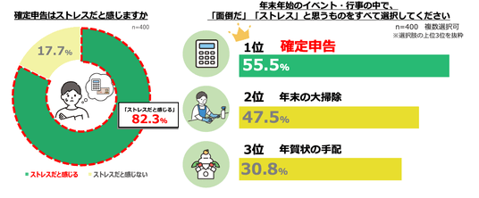 1.約8割(82.3%)が「確定申告はストレス」と回答! 年末年始のストレス行事のうち、確定申告が1位に 「作業が面倒」「時間がかかる」といった声が多く、“年末年始最大の憂鬱イベント”である実態が明らかに