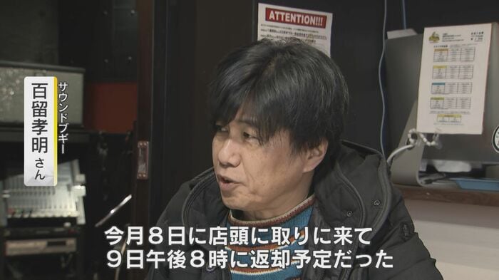 騒動の発端は、音響機器の貸し出しについての問い合わせ。「1月8日に店頭に取りに来て、9日午後8時に返却予定だった」と話すのは、『サウンドブギー』スタジオ担当の百留孝明さん。