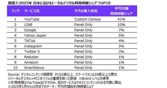 トータルデジタルのGRPや利用時間シェアに着目すると、「YouTube」は利用時間シェアで41%(2024年:37%)に達し、全インターネット利用時間の4割以上を単一のプラットフォームが占めています。またGRPにおいても、1位となっています(図表2、3)。さらに利用時間シェアにおいて、TikTok(4%)がInstagram(3%)を上回り、5位に浮上しました。消費者の時間が「コミュニケーション」から「動画コンテンツの消費」へとシフトしている様子が伺えます。
