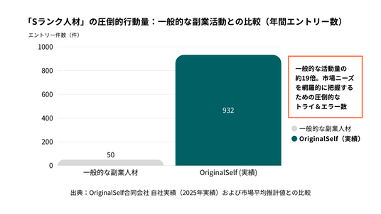 ※1「上位0.1%水準」:一般的な副業希望者の年間エントリー数を10~50件(当社推計)とした場合、当社の年間932件という活動量はその約20~90倍に達することから、統計的分布において上位0.1%未満の層に位置すると推定したものです。※「Sランク」:年間活動量が市場平均の20倍以上、かつ公募成約率が一定水準(2.0%)を超えた人材を指す当社独自の評価区分です。