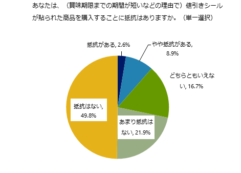 - 値引きシールが貼られた商品に「あまり抵抗はない」「抵抗はない」と回答した人が合わせて7割を占めていた。