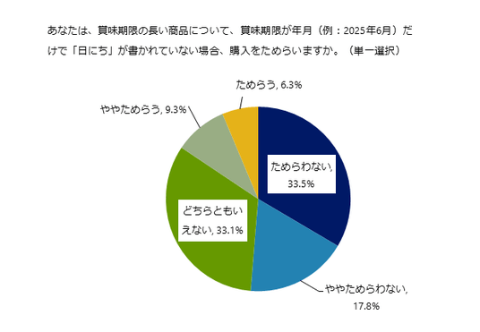 - 賞味期限年月表示については、賞味期限で「日にち」が書かれていない場合であっても、「ためらわない」「ややためらわない」を合わせて5割強と過半数であった。