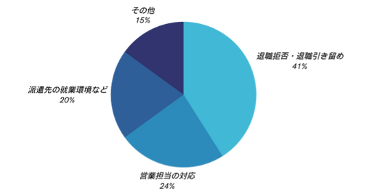 中でも契約期間(有期雇用契約)途中の退職を拒否するというケースが多く、病気や怪我・家族の介護や看病などのやむを得ない理由があっても、派遣会社側が一方的に退職拒否するという声が全体の41%となり、多数を占めました。