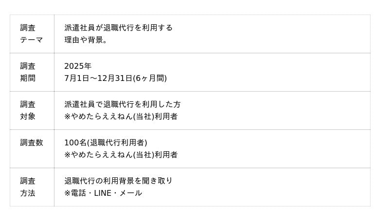 調査対象は当社の退職代行サービスを利用した方(退職代行やめたらええねんの利用者)で派遣社員100名が対象となります。