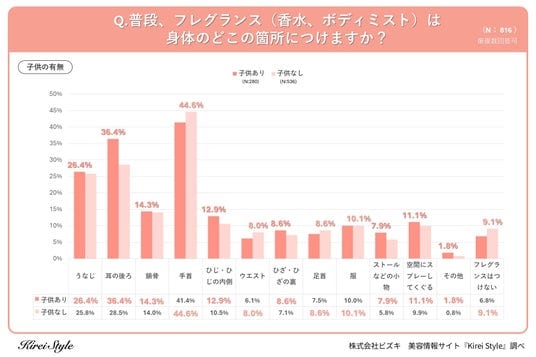 子供の有無で見ると、ライフステージの変化も香りの楽しみ方に影響を与えていることが分かります。「子供あり」の人と「子供なし」の人を比較すると、「子供あり」の人は「耳の後ろ」につける割合が36.4%と、「子供なし(28.5%)」に比べて明らかに高い傾向が見られました。 小さなお子さんがいる場合、抱っこをしたり手を繋いだりする機会が多く、子供の顔に近づく手首や、子供が触れやすいウエスト周りへの使用を避けている可能性が推察されます。「おしゃれはしたいけれど、子供への配慮も忘れない」というママたちの優しさと工夫が、この「耳の後ろ」という選択に表れているのかもしれません。