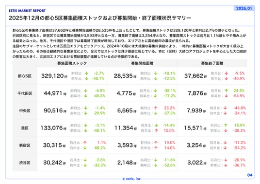日本最大級の商業用不動産データ分析基盤「estie マーケット調査」を中心に複数のサービスを提供する株式会社estie(本社:東京都港区、代表取締役:平井 瑛、以下「estie」)は、「estie マーケット調査」による分析データをまとめた最新不動産マーケット動向レポート「エスティ マーケットレポート」2026年1月号を配信開始しました。