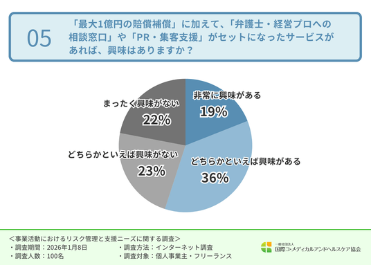 「最大1億円の賠償補償」に加えて、「弁護士・経営プロへの相談窓口」や「PR・集客支援」がセットになったサービスがあれば、興味はあるか伺ったところ、「非常に興味がある(19.0%)」「どちらかといえば興味がある(36.0%)」と、半数以上が前向きな関心を示しました。