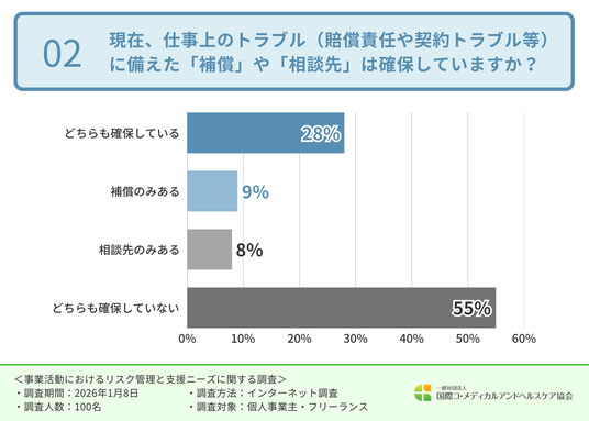次に、現在、仕事上のトラブル(賠償責任や契約トラブル等)に備えた「補償」や「相談先」は確保しているか伺ったところ、「どちらも確保していない(55.0%)」という回答が最も多い結果となりました。