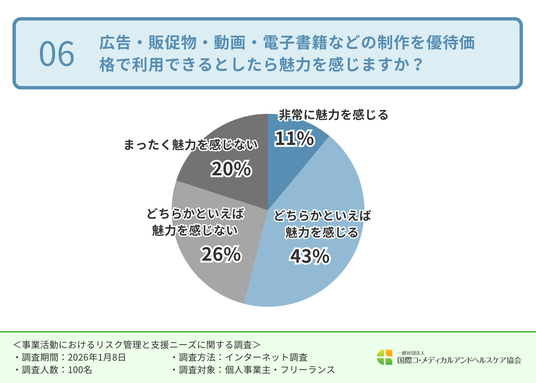 次に、広告・販促物・動画・電子書籍などの制作を優待価格で利用できるとしたら魅力を感じるか伺ったところ、「非常に魅力を感じる(11.0%)」「どちらかといえば魅力を感じる(43.0%)」という回答が集まり、半数以上が魅力を感じており、集客・PR支援へのニーズの高さが明らかになりました。
