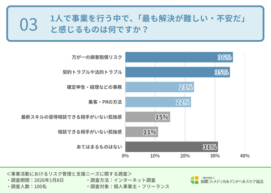 そこで、1人で事業を行う中で、「最も解決が難しい・不安だ」と感じることを伺ったところ、「万が一の損害賠償リスク(36.0%)」「契約トラブルや法的トラブル(35.0%)」が上位に挙がり、リスク管理への不安が強い結果となりました。