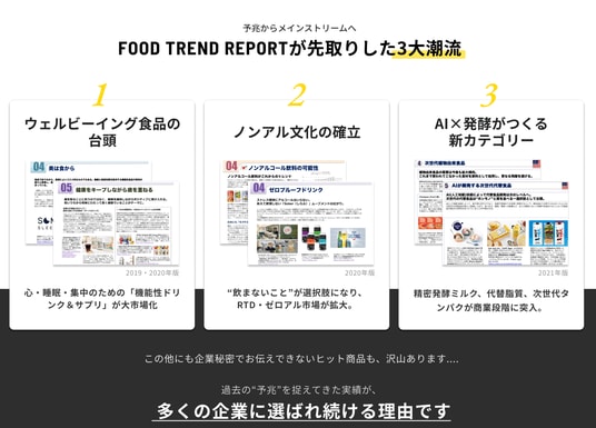 大手飲料メーカー 商品開発部「Food Trend Reportは"なぜその味・カテゴリーが来るのか"を理解できる。20万円でこの解像度は正直本当に有り難く、⾮常に重宝している」