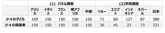表:小4の国別回答者数。中2は付録のPDFをご参照ください。