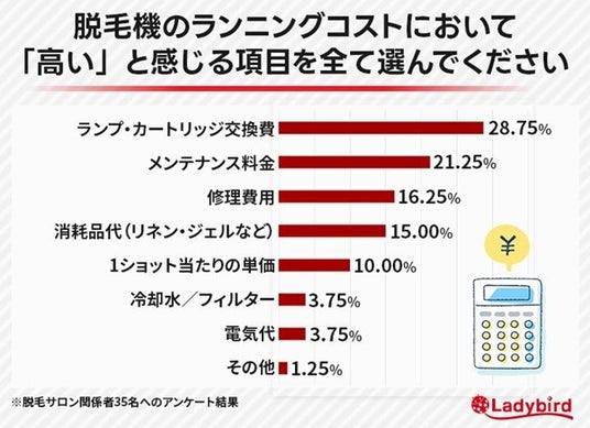 「あなたの人生に驚きと笑顔を創る」をミッションに、業務用美容機器開発・製造・販売・卸業、エステ商材販売、サロン運営支援をしている株式会社レディーバード(本社:東京都品川区、代表取締役社長 横沢直希、以下、当社)は、脱毛サロン関係者を対象に「脱毛器のランニングコストに対するアンケート」を実施しました。