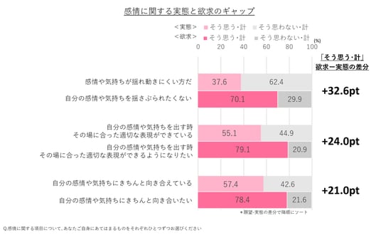 感情に関する意識の実態と欲求の差分に着目してみると、差分が最も大きかったのは「感情や気持ちが揺れ動きにくい方だ(37.6%)」という実態に対し、「自分の気持ちを揺さぶられたくない(70.1%)」という欲求で、その差は32.6ptでした。感情を出さないようにするためには、そもそも感情を揺さぶられることなく凪の状態でいたいということかもしれません。そして2番目に差分が大きかったのは、「自分の感情や気持ちを出す時、その場に合った適切な表現ができている(55.1%)」と「自分の感情や気持ちを出す時、その場に合った適切な表現ができるようになりたい(79.1%)」の24.0pt差、3番目に差分が大きかったのは「自分の感情にきちんと向き合えている(57.4%)」と「自分の感情や気持ちにきちんと向き合いたい(78.4%)」の21.0ptでした。