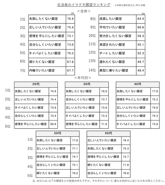 「失敗したくない」「タイパよくしたい」など、現代ならではの願望の所持率をランキング形式でみてみると、1位は「失敗したくない願望(76.9%)」、2位は「正しい人でいたい願望(75.4%)」でした。3位には「感情を平らにしたい願望(73.1%)」がランクインしており、5位の「タイパよくしたい(70.3%)」を上回る結果となりました。感情を抑えやすくするために、感情の揺れは最小限にして凪の状態を保ちたいという欲求のあらわれかもしれません。年代別では、60代以外の年代で「失敗したくない願望」が1位となりました。2位は、20代「正しい人でいたい願望(75.4%)」、30代「自分らしくいたい願望(73.7%)」、40代「感情を平らにしたい願望(75.2%)」、50代(正しい人でいたい願望(77.1%))、60代「失敗したくない願望(75.3%)」と、年代ごとの特徴が出ています。また20-40代では「タイパよくしたい願望」、50-60代では「頼りたくない願望」がランクインしており、年代によって所持する願望の種類が異なっていることがわかります。