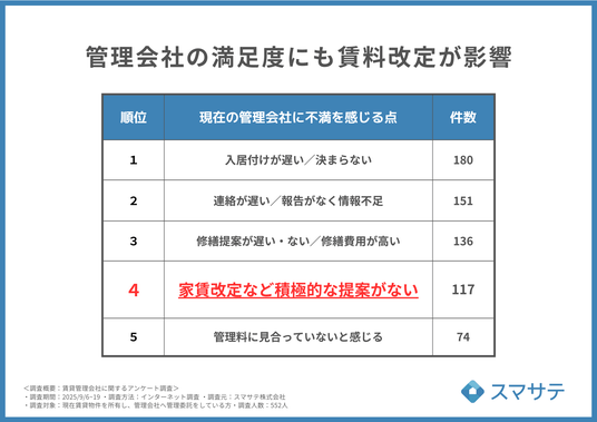 物価や人件費高騰でオーナーはキャッシュフロー悪化の局面にあるため、所有物件の家賃上げは切実な課題となっています。スマサテが調査を行った管理会社への不満ランキングでも4位は「賃料改定などの積極的な提案がない」で、オーナー満足度にも直接影響していることがわかります。(※3)