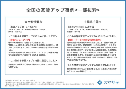 2025年10月28日~11月12日に対象となる賃貸管理会社及び賃貸不動産オーナー909名へ家賃アップに関するアンケートを実施、その結果をもとに全国の家賃改定の傾向、実際に採用した家賃アップの方法ランキング、家賃アップに成功した取り組み事例などをまとめた資料の無料配布を開始しました。賃貸管理会社の、全国最新の家賃アップ事情や実際に採用されている手法の把握、賃貸オーナーの管理解約防止に役立ちます。