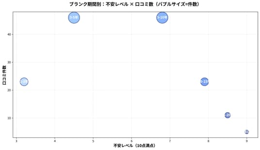 ブランク3年を超えたあたりから不安が表面化し、5~10年で再開行動が集中。10年超では不安が固定化しやすい傾向が、累積分布から読み取れる。