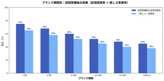 初回講習後の成果は、全層で「自信回復」が「楽しさ実感」に先行。ブランクが長いほど、初回は“きっかけ”としての役割が大きくなる。