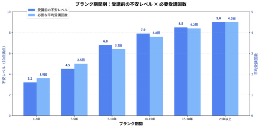ブランク期間別に「受講前の不安レベル(10点満点)」と「平均受講回数」を重ねて分析した結果、