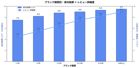 ブランク期間別に「成功実感(成功指標スコア)」と「レビュー詳細度」を整理すると、