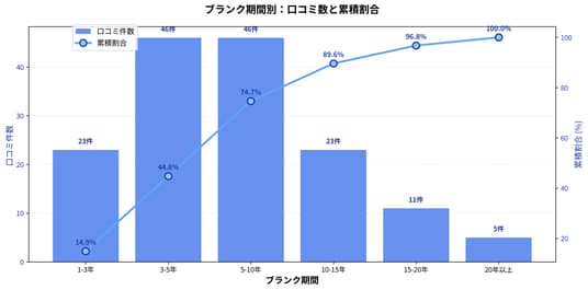 ブランク年数ごとの口コミ件数に累積割合を重ねて可視化したところ、