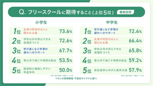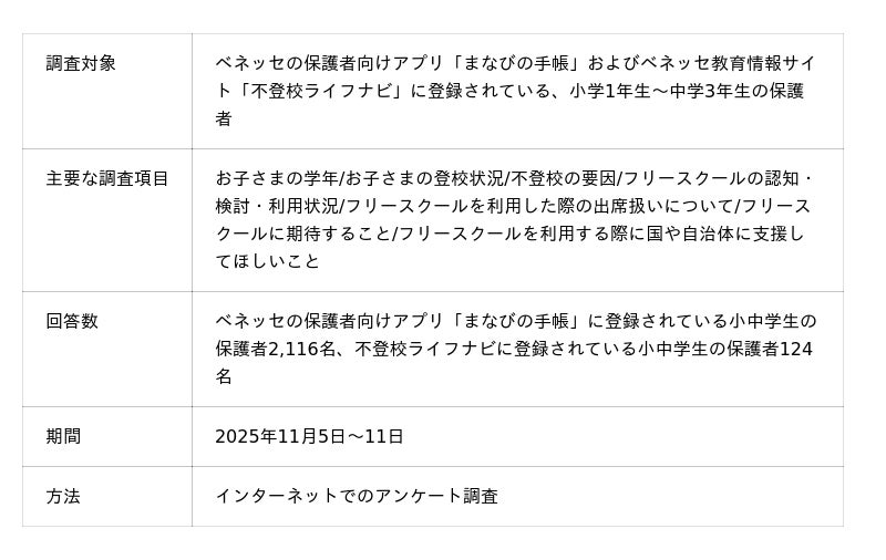 株式会社ベネッセコーポレーション(本社:岡山県岡山市、代表取締役会長兼社長:岩瀬大輔、以下:ベネッセ)が運営する、不登校に関わるご家族やお子さま向け情報発信サイト「不登校ライフナビ」は、ベネッセの保護者向けアプリ「まなびの手帳」に登録されている小中学生の保護者2,116名、不登校ライフナビに登録されている小中学生の保護者124名、計2,240名を対象に、「不登校・フリースクールに関する意識調査」を実施しました。