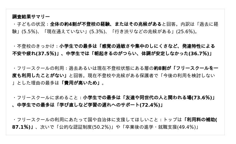 適切な環境を求められる可能性があるフリースクールについては必要性が語られていても、認知不足や費用面の負担、地理的な制約によって利用が進んでいない現状があります。通学を望む家庭、オンラインとのハイブリッドを求める家庭など、子どもにとって無理のない学び方を選べるように「環境側の選択肢が増えること」の重要性も、調査からは浮かび上がりました。
