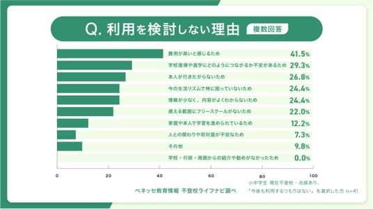 「今後、フリースクールを利用するつもりはない」と回答した、現在不登校状態、もしくは行き渋りなどの兆候がある方に理由(複数回答)を質問したところ、「費用が高いと感じるため(41.5%)」が最も多く、次いで「学校復帰や進学にどのようにつながるか不安があるため(29.3%)」「本人が行きたがらないため(26.8%)」となりました。