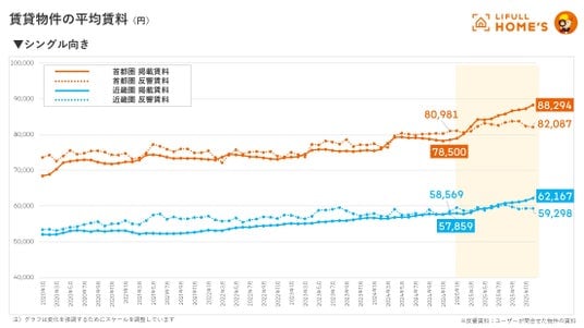 2025年12月の賃貸物件の掲載賃料は、首都圏シングル向きで88,294円(前年同月比+24.8%)、ファミリー向きで148,682円(同+14.0%)、近畿圏シングル向きで62,167円(同+7.5%)、ファミリー向きで86,230円(同+6.3%)となり、いずれも2020年の計測開始以降の最高値を更新しました。