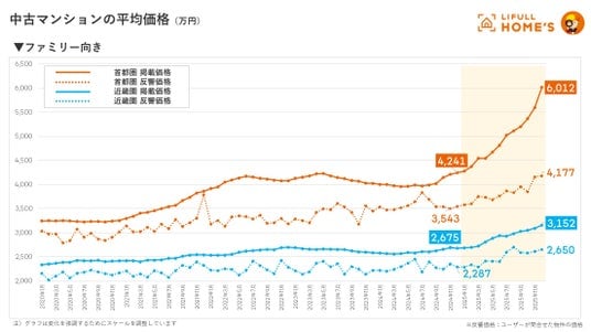 2025年12月の中古マンションの掲載価格は、首都圏(東京都、神奈川県、埼玉県、千葉県)シングル向き5,210万円(前年同月比+41.8%)、ファミリー向き6,012万円(同+41.8%)、近畿圏(大阪府、兵庫県、京都府)シングル向き2,807万円(同+24.1%)、ファミリー向き3,152万円(同+17.8%)となり、いずれも2020年の計測開始以降の最高値を更新しました。