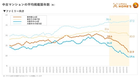 ・掲載築年数は1年間で東京都心部が7年、大阪市中心部が6年若返る