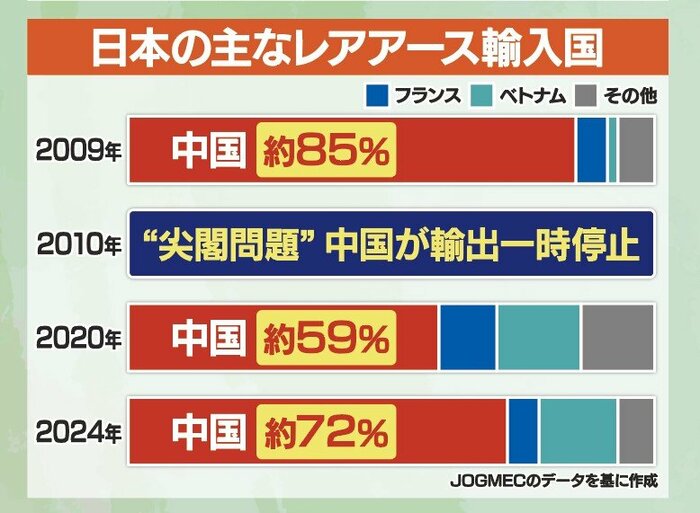 中国に対して頼っている部分がありまして、振り返れば2009年は中国から85%のレアアース輸入量。2010年に尖閣問題があり、中国が輸出を一時停止していました。2020年には減少傾向にあったわけですけれども、2024年は72%の輸入量。2020年から2024年にかけて増えているのはなぜなんでしょうか。
