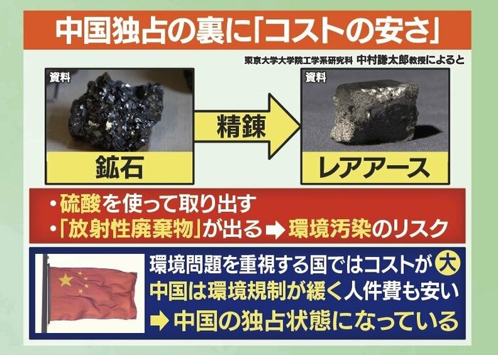 (レアアースを)「レア」って付いてるんですけど、そんなにレアじゃないです。埋蔵はされてるんですけども、結果として精錬段階でコストもかかり、環境性もかかるから、中国にある意味任せてきたというところのツケが、今来ているということですね。