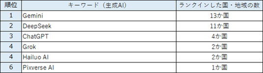 「AI」カテゴリのキーワードは、延べ34回ランクインし、その内ツール名を示すキーワードについては、Googleが提供する「Gemini」が最も多く、13カ国・地域でランクインしました。