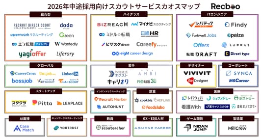 スタートアップ企業向け中途採用支援サービス「Recboo(リクブー)」を提供する株式会社ノックラーン(本社:東京都大田区、代表取締役:福本英、以下ノックラーン)は、中途採用市場における媒体選定を支援するため、「2026年中途採用向けスカウトサービスカオスマップ」を公開しました。